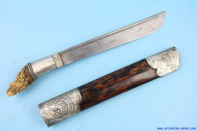 This short Dah knife is late 19C. Probably coming from Laos or Cambodia. Massive blade with a thin fuller 8 1/2 inches long. Silver bolster. Antelope horn handle with a large silver sleeve and traces of fur. Wood scabbard with engraved silver mounts. Total length 12 1/2 inches. Very good condition |