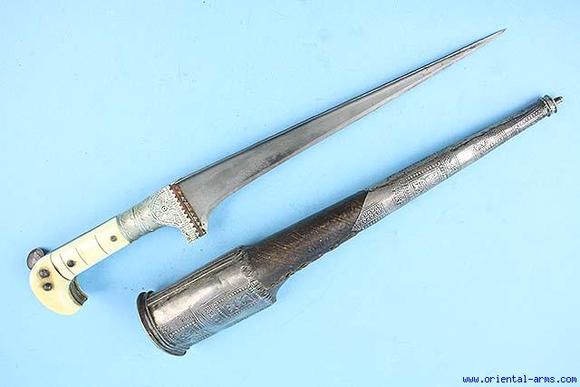 This dagger is coming from our private collection. Choora daggers are supposedly coming from Afghanistan. They are quite common and all of similar shape. The one offered for sale here is quite exceptional with an wootz (Watered, Damascus ) steel. Probably late 19C. or a bit later. Finely forged blade with a strong T spine, 9 inches long. Four sectors ivory grips with silver bolsters and grip strap and with a 19C silver coin attached to the pommel. Original leather covered scabbard with silver mounts. Total length 13 1/2 inches. very good condition. |