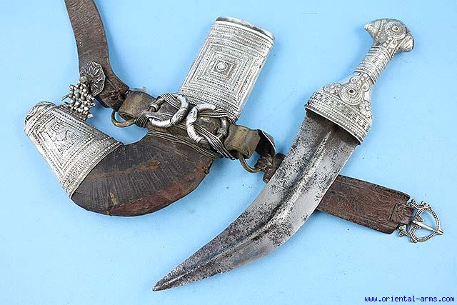 We offer for sale this Arab Jambiya dagger from Oman, in the royal style known as Saidi . It has a well forged, 7 ½ inches long, curved and dual edge blade with a central rib. The hilt is silver in the classical “I” shaped, decorated with many small silver filigree pieces. The scabbard is “L” shaped covered with leather. The belt attachment is made of arrangements of 4 silver rings and twisted silver wire. All scabbard and hilt fittings are silver chased in a typical design. This dagger comes with its original leather belt with a silver buckle. Good condition. Lightly pitted blade. Losses to the silver handle the silver mounts and the leather cover. Low price. . |