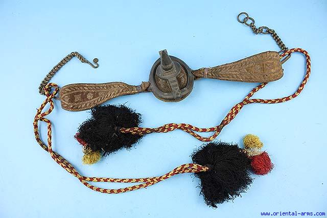 Up for sale is this belt used by the Coorg people to carry their Ayda Katti swords. Heavy brass ring with sides fabric strips ending with heavy brass chains and long colorful tassels. The fabric strips are embroidered with golden threads. Complete set in very good condition, late 19C. Very Rare. |