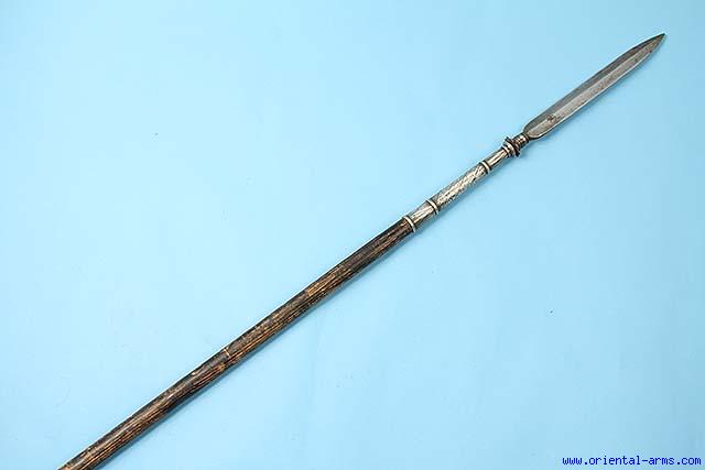 This very good spear is Indonesian, probably from Java. late 19C. Nice 10 inches blade, most probably of laminated steel. large finely chased silver collar. Wood haft (no tail). Length 68 inches. Very good condition.