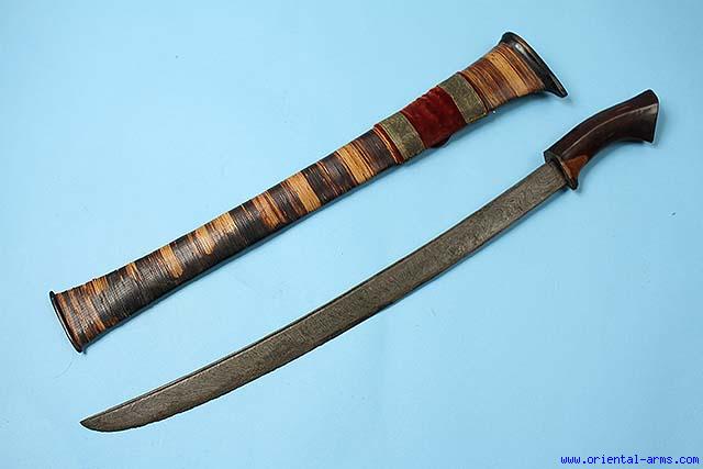 Up for sale is this heavy sword, Parang style, most probably Javanese, early - mid 20 C. Fine heavy blade, 19 inches long, with clear pamor structure. Polished wood handle. Wood scabbard entirely bound with rattan strips and with a thread loop for carrying belt. Total length 25 inches. Very good condition. Impressive sword. |