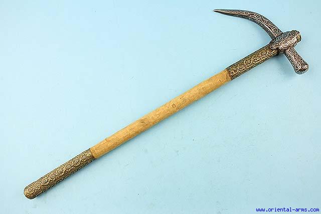 Up for sale this very fine and extremely rare Ottoman war hammer. The blade is 8 inches long (tip to tip), beautifully inlaid with silver in clasical pattern. The shaft is wood covered with fadded yellow velvet and two chased brass mounts. total length 21 inches. It is dated to 17 or 18c tukey or eastern ottoman empire. |
