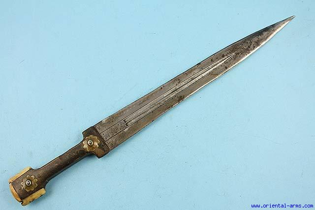 This Qama dagger is most probably of Balkan origin. Classical shaped blade 13 inches long, nicely fullered marked and dated 1343 in the Islamic calendar ( 1924 in the Gregorian calendar). Black horn grips with bone pommel sides and brass rosettes. Total length 18 inches. Very good condition. No scabbard. |