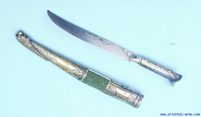 This small beautiful knife is of Turkish origin and known as Bichaq. It has a single edge blade 7 inches long engraved and dated 1272 in the Islamic calendar, which corresponds to 1855 in the Gregorian calendar. The hilt is black enameled (Niello) and gilded silver with “ears” in the Yatagan handles style. The scabbard is wood, covered with green velvet and mounted with chased brass mounts with a big “Dolphin” classical Turkish scabbard tip. Total length (in scabbard) 12 ½ inches. Very good condition. The left “ear” is very slightly bent. All parts are original (except the later velvet cover). Offered here at a very attractive price. |