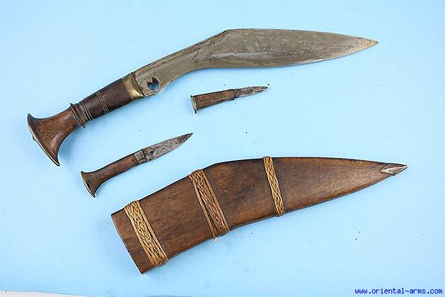 This Very Good Khukuri is Nepalese, mid 20C. Well made blade 10 1/2 inches long. Wood grip with brass bolster and pommel cap. Box style wood scabbard bound with braided rattan strips and with a steel chape. Accompanying knife (Karda) and Steel (Chakma) in a rear compartment. Total length 15 inches. Very good condition. An interesting Khukuri |