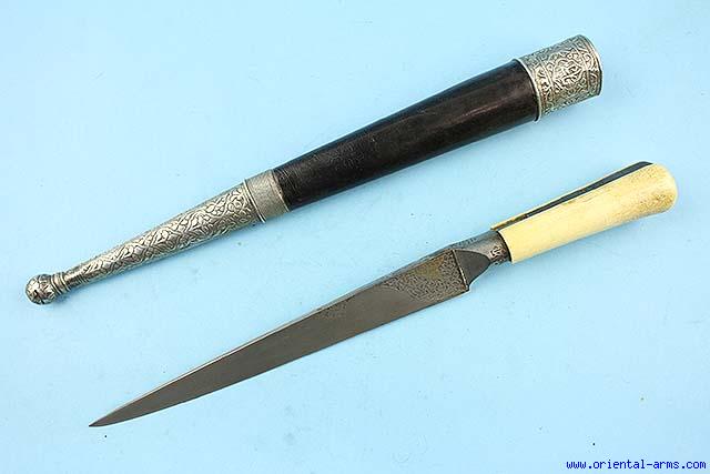 This Fine Kard knife is Persian, late 18C. Massive 10 inches blade forged from fine wootz (Watered, Damascus) steel with good contrast pattern. The blade forte and the spine as well as the steel grip strap are finelt chiseled and with traces of gold inlay decoration. Walrus ivory grips. Wood scabbard with leather cover and large chased silver locket and chape. Total length 19 inches. Very good plus condition.