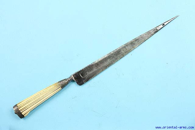 We offer for sale this beautiful Vendetta knife from Corsica, Mid - Late 19C. These knives was used exactly for the purpose they are called: To brutally settle disputes in the family honor name. Blade 8 1/2 ½ inches, finely fullered and pierced at the tip. Ribbed ivory grip with engraved silver mounts . Total length 13 inches. Very good condition. No scabbard |