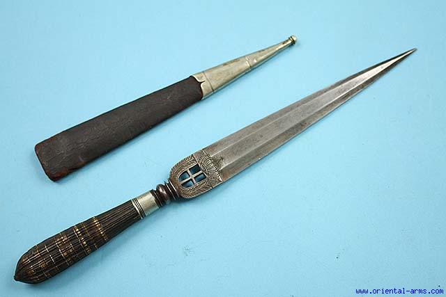 This very good dagger is probably from South Italy, early - mid 19 C. 7 1/2 inches long solid blade finely fullered and finely pierced and engraved. Ribbed grip composed of horn and bone layers, with silver collar and steel bolster. Original leather covered scabbard with steel mounts (Locket missing). Total length 12 1/2 inches. Very good condition. Beautiful dagger. |