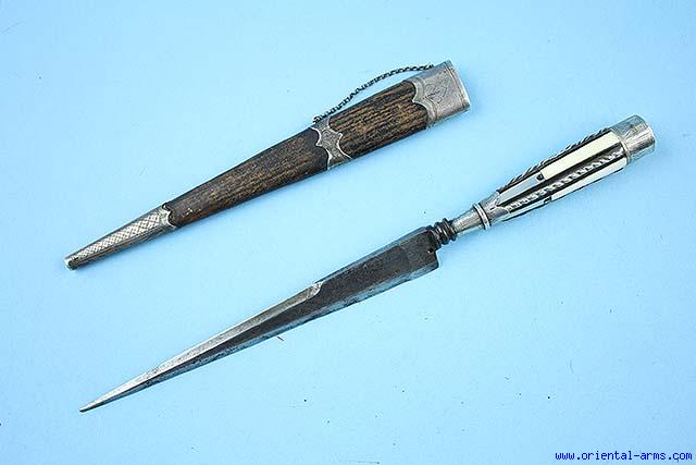 We offer for sale this beautiful Vendetta knife from Corsica, Mid - Late 19C. These knives was used exactly for the purpose they are called: To brutally settle disputes in the family honor name. Thick blade 6 1/2 ½ inches long, etched with Vendetta . Dark wood grip with silver, Ivory and Mother of Pearl decorations and silver pommel cap and collar. Original wood scabbard with engraved silver locket, Chape and hanging band. Total length 13 inches. Very good condition. Minor edge Knick. |