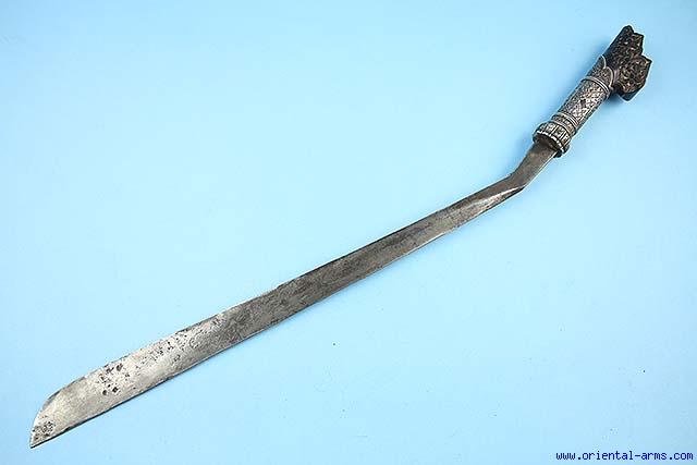 The Parang Latok is a rare Sword / Machete from Kalimantan (Borneo). It is characterized by the heavy wedge blade widening toward the tip, with its lower unsharpened part and the hilt abruptly bent upward, allowing two hands grip of the sword. This one has a 20 inches long blade, 10 mm thick. A square heavy blade extension and a dark wood hilt beautifully carved with chased silver collar. Total length 28 inches. Very good condition. Nicely patinated blade with edge sharpened. Minor pitted spots and edge knick. Very minor loss to the silver collar. Late 19c or early 20th. |