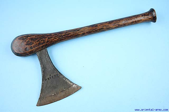 Up for sale is this good axe of the Songye people from central Zaire. A flaring blade, 6 inches long and 5 inches edge, pierced and incised with geometrical design decoration. Wood haft. Very good condition. Early 20 C. Very low price.