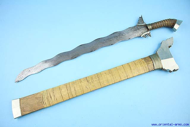 This Moro Kris sword employ a wavy blade, 21 inches long. White metal reinforcing bands secure the blade to the handle. Wood grip bound with fibers with white metal covered pommel. Wood scabbard bound with rattan and white metal panels. Later wire binding on the grip and the scabbard. Total 27 1/2 inches. Very good condition. Mid 20C. |