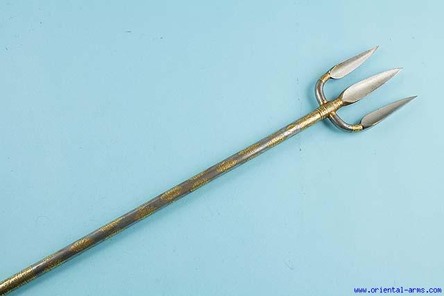 Up for sale is this very fine trident. Indian, early 19C. or earlier. Triple blade of hollow ground cross section 3 inches long each. Steel haft with a knob end. Very finely gold inlaid all around. Length 30 inches. A very fine piece in perfect condition. |