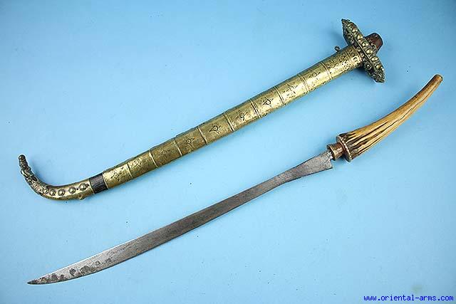 A complete authentic sword of the karo Batak people from Sumatra, also known as Piso Halasan . Heavy blade, 19 inches long and almost 1/2 inch thick at its base. of laminated steel. Deer horn handle with brass fittings and brass covered scabbard with up-rising tip. Total length 30 inches. Very good condition. A rare sword. For a similar one see: A. Sibeth, THE BATAK, Peoples of the island of Sumatra |