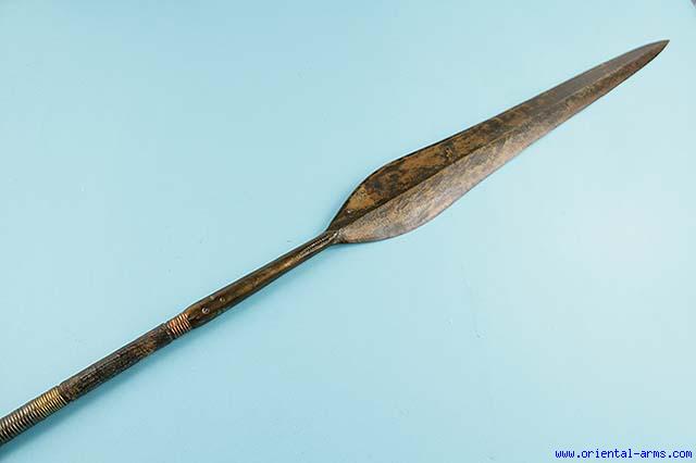This large spear is early - mid 20C. Congo (we are not sure about the exact tribe). Very well made and in excellent condition. Massive 23 inches long, 3 inches wide blade with nicely forged central rib. Haft tightly bound with leather strip and alternately bands of copper brass and steel. Central swollen and carved grip. Tubular steel tail. Total length 61 inches. very good plus condition. Very impressive spear.