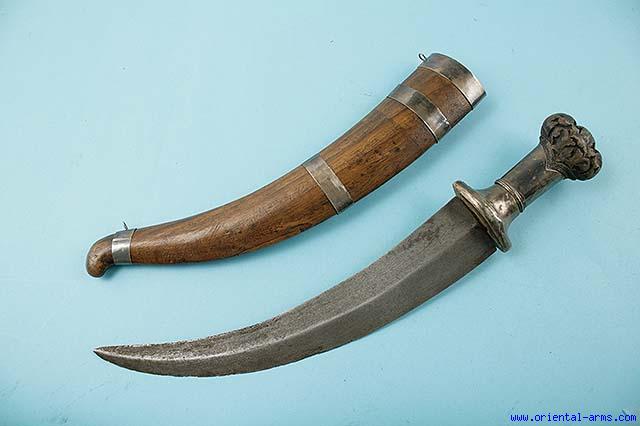 This rare Indonesian dagger in the style of an Arab Jambiya is also known as and found in Sumatra and Mentawi islands. Its massive curved blade is 10 1/2 inches long, forged from pamor steel. The handle is black horn with a finely carved pommel and silver collar. The wood scabbard is bound with silver strips and silver locket. Total length 15 ½ inches. Very good condition. Minor blackened spots on the blade. Very a scarce item. |