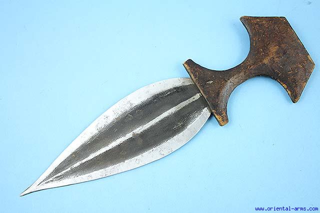 Up for sale is this good quality dagger of the Lobala people from Northern Zaire. Very typical in the blade shape and big wood handle with flared pommel. The blade is 9 1/2 inches long; spearhead shape with a central shallow rib and with the original blackened patina. The wide handle is 5 inches wide. A collection catalog number is printed on the top of the pommel. Total length 14 1/2 . Very good condition. No scabbard. |