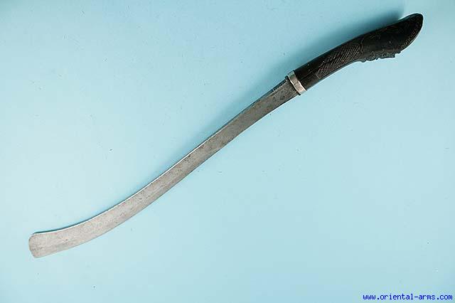 Up for sale is this one of the many Klewang variants, carried by the Ache people of Sumatra. The very heavy 26 inches blade is slightly up-curving, widest near the tip, with a sharply down curving tip of spine to meet the edge. Beautifully carved horn handle. Good condition. Age crack on the handle but holds very solid. Total length 31 inches. This variant of Klewang is also known as Ladeng or Ladieng |