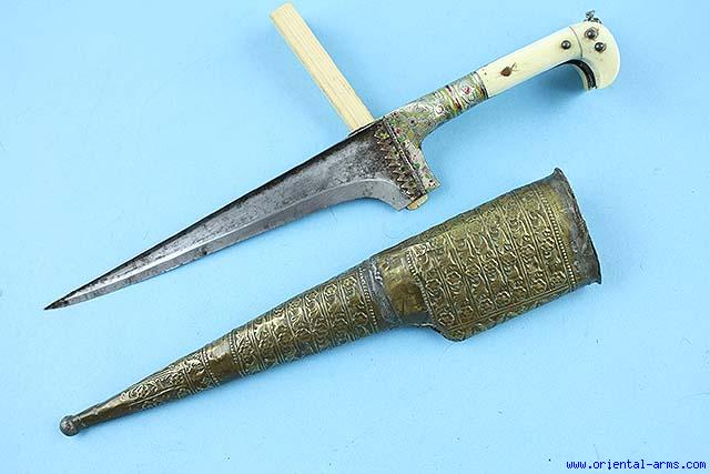 This Choora knife is a typical example from the second half of the 19th century and it is coming from the Khayber pass area between India and Afghanistan. It was carried by the Mahsud people residing in this area. The blade is 7 inches long with the usual “T” back and reinforced edge. The grips are made of sectors of elephant ivory riveted to the tang with four rivets. Four small metal bells are attached to the pommel top. The bolster and the hilt strap are engraved white metal with painted spots. The scabbard is wood, covered with chased brass. Total length in scabbard 12 1/2 inches. Very good condition. Minor edge nicks and blackened spots on the blsde. All parts are old and original. |