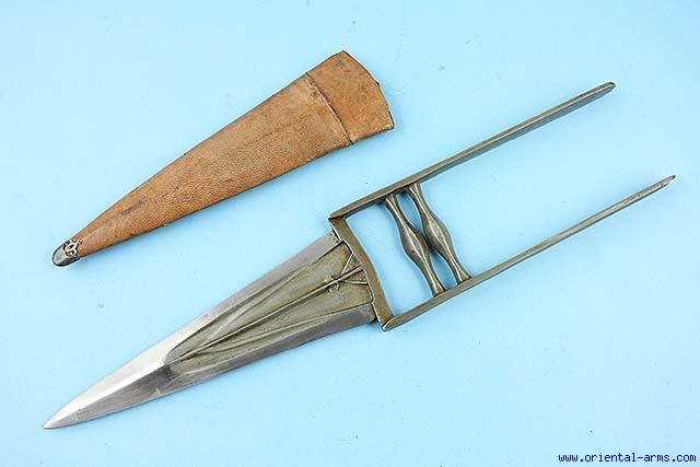 This heavy Kattar dagger is coming from Rajasthan, India, early 19 C. The whole Kattar, blade and handle are forged from crystalline Wootz (Watered, Damascus) steel. Blade with a central rib in the middle of a wide fuller, reinforced edges and thickened tip is 10 inches long 3 inches wide. Polished and etched leaving the edges and the tip polished. Leather covered scabbard with a steel tip. Total length 21inches. Very good condition |