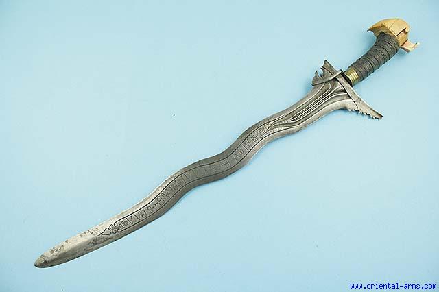 This Kris is early version, probably late 18 to early 19 C. The fine blade is forged from twisted steel core, forge welded between high carbon steel hard edges. Wavy blade 20 inches long with might be inscription on both sides of the blade. One steel clamp is reinforcing the blade in the handle. The grip is bound with fiber. Ivory Cockatoo style pommel. Total length 24 inches. Very good condition. Fine age patina on the pommel. No scabbard. |