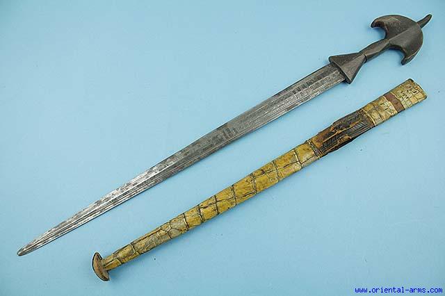From southern Sudan or nearby areas comes this rare dagger. Fine 18 1/2 inches steel blade engraved with geometrical pattern. Big handle with a lunette shaped pommel carved from Rhinoceros horn with clear fibrous structure. Scabbard covered with Crocodile skin. Total length 27 inches. Very good condition. Partially open seam on the scabbard. |