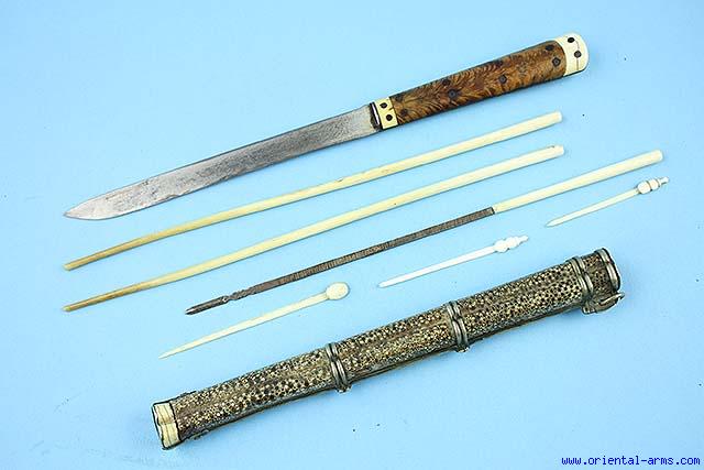 A Chinese ‘trousse’ (eating set), comprising a knife and chopsticks. This type of sets was very common in china and in all the countries under the Chinese influence from Tibet to Mongolia. It was part of a man formal dress up to the turn of the 20th century and usually accompanied with a variety of accessories like pickle spear, toothpicks, tweezers and the like. Similar sets are found in various sizes and quality. This one is late 19c. The blade is spine, 7 1/2 inches long forged from laminated steel. Grained wood grips with ivory mounts. Wood scabbard with polished natural color ray skin cover with great oage patina. Bone chopsticks with age patina, metal pickle spear and three toothpicks. Total length 12 1/2 inches. Very good condition.