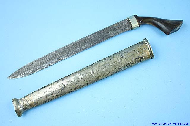 The Badek (or Badik) is a knife / dagger from Java, Indonesia. It is characterized by its single edge blade and the pistol grip shape handle. This one has a classical shape blade: 9 inches long, forged from good pamor steel with nice and clear pattern on the entire blade, both sides. Polished horn handle. Wood scabbard with silver sheet cover. Total length (in scabbard) 12 1/2 inches. Very good condition. Minor dents on the scabbard. |