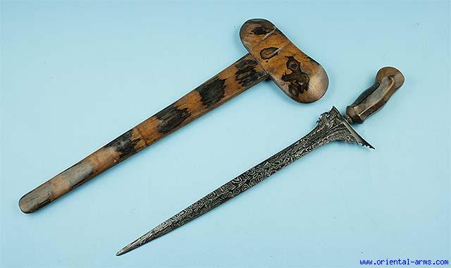 This Balinese Keris sword is mid - late 19 C. Finely forged pamor blade with extremely fine polished black and white pattern 15 1/2 inches long blade. Wood handle of classical form. Mendak set with colored stones. Classical grained wood scabbard. Total length 24 inches. Very good condition. From an old private European collection.