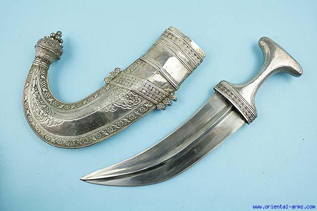 This Jambiya dagger is a fine example of Daggers made for wealthy Arabs residing in India. It is a fine mix of Arab and Indian styles of weaponry and decoration. The shape is of a classical Arab style where as the materials and decoration is classical 19C. Indian. The curved double edge blade is 8 inches long with a central rib. The handle is silver very clean and elegantly made. Silver scabbard chased with intricate floral design. Very good condition. total 12 inches long. a fine item. |