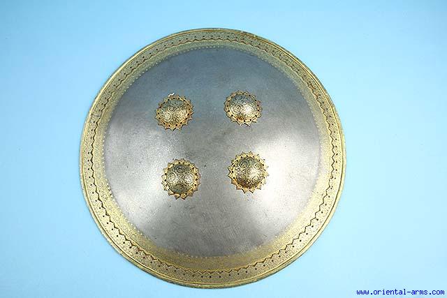 A rare and beautiful 19c Indian shield from north India. The shield is made entirely from pattern welded (Damascus) steel. Four bosses and the rim inlaid with floral design of gold Koftagary technique.