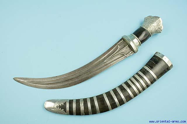 A rare Indonesian dagger in the style of an Arab Jambiya is also known as and found in Sumatra and Mentawi islands. The curved blade is massive of fine quality fullered with central ridge 12 inches long. The handle has dark horn grip with silver pommel and collar. horn scabbard is bound with silver strips and silver chape. Total length 16 inches. Very good condition. Very fine and scarce item. |
