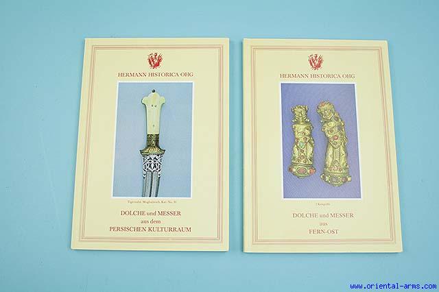 Text: Up for sale are these two booklets published by Hermann Historica, 1970's: Dolche und Messer aus dem Persischen Kulturaum and Dolche und Messer aus Fern Ost . Soft cover, small format, covering many types of knives and daggers from The Middle east, Turkey, Mediterranean basin, Persia, India Indo China Indonesia and others. Many black and white photos and colored plates. Very good condition. |