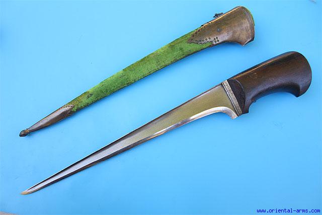 Up for sale is this unusually large Karud dagger from India, a family member of the Pesh-Kabz Daggers. The sturdy blade is 15 inches long, with a strong T spine, is made of good Indian (crystalline) wootz. The massive hilt is carved from a huge chunk of wood 2.3 inches across and 8 inches girth, decorated with small dots to imitate rhino horn. This Karud comes with its original scabbard with brass locket and chape. Total length 22 inches. Very good condition. To demonstrate the dimensions it is shown below next to a more common Karud dagger |