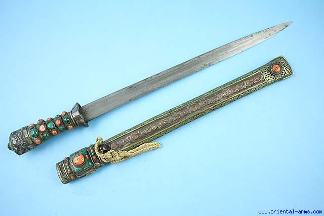 A vrty fine Tibetan short sword, locally known as tsep-sa . Blade of typical Tibetan shaped but short, 16 inches long, more of a dagger than a sword, but beautifully laminated and folded in the pattern known a Hairpin Folding. The same pattern appears on the long and heavy Tibetan swords. The wood handle is covered with Sting Ray skin and set with numerous red Corals and green Malachite stones. Silver and brass finely chiseled pommel. The scabbard is Silver brass and copper combination with the top part decorated in a similar style to the grip. Total length 21 inches. Very good condition. A very fine sword. |