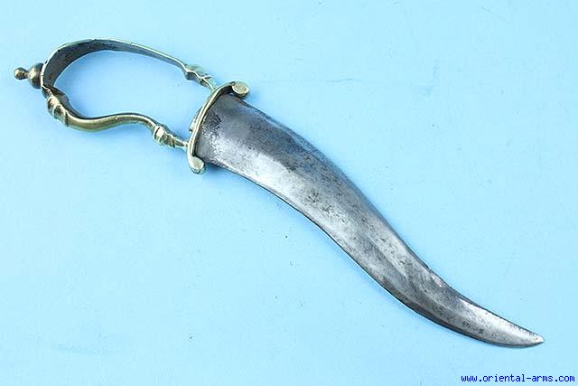 This dagger is a ‘BICHWA’ meaning: ‘The Scorpion Sting’. It is Indian. Old. early - mid 19 Century. The blade is double edged, re-curving, 7 1/2 inches long, riveted to the ring shaped hilt. The grip is brass. Very good condition.