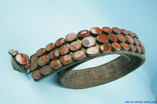 This heavy and wide belt is Ottoman, 19C. supposedly used by warriors to hold the weapons. Wide 3 inches leather base belt set with many pierced brass, small metal nails and a array of large carnelian stones. Altogether 36 big stones and two smaller stones (One big stone missing). length 50 inches. Very good condition. missing nails. An impressive heavy belt. |