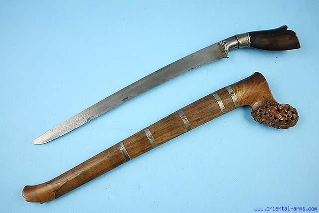 This large Sewar knife is from Sumatra late 19C. The blade is 12 inches, slightly down curving, single edged and forged from laminated steel. Carved horn handle with silver collar. Wood scabbard bound with silver bands and finely carved down protruding extension. Total length 18 inches. Very good condition. |