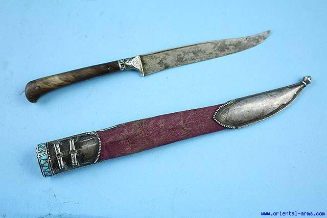 This fine piece is coming from Bukhara. A typical small knife with wootz blade, 4 inches long. Grips are rhino horn (one grip partially repaired). The bolsters and grip strap nielloed silver. The scabbard is covered with velvet and mounted with silver locket and chape. Both the bolster and locket are set with a row of small turquoise stones in a typical Bukhara style. Total length 9 inches. Very good condition.. The scabbard fabric is a later replacement. A fine complete item. |