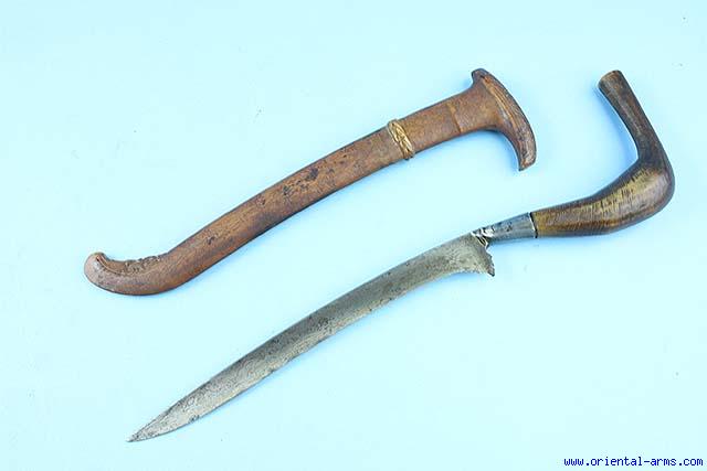 A very good RENTONG knife / dagger from the Malay Archipelago. The version offered here is mostly used by the Achenese people from North West Sumatra (see Stone Glossary, fig. 106 number 4 page 85). The blade is 10 inches long down curving and single edged, forged from fine laminated steel. The hilt is horn with sharply up-curving pommel. The scabbard is finely engraved wood. Total length 17 inches. Very good condition. An authentic piece from the second half of the 19th C. attractive and decorative item. |