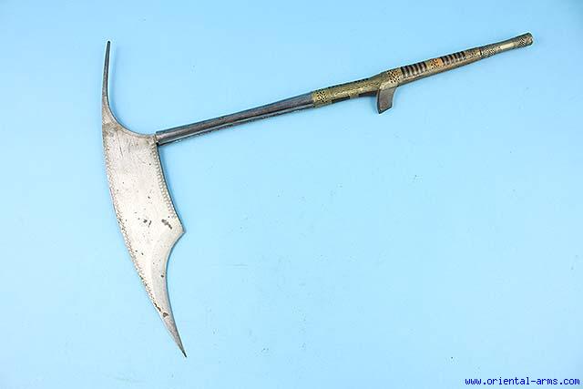 The most known weapon associated with head hunting of the Filipino tribes is the Head Axe. It is characterized by its specific blade shape with the long rear projection. Beside warfare, It was also used as a multipurpose cutting tool, worked in a very peculiar way: The long rear spike was driven in the ground, holding the axe in place edge up, and the cut object was drawn along the edge. We offer here for sale a fine example, probably belonging to high ranking person of the Kalinga (?) tribe. , 17 inches blade (Point to point) with concave edge. 24 inches haft with a long steel ferrule. And wood handle finely decorated with brass strips and bands. Iron tip. Very good condition. Minor blackened spots on the blade. A fine authentic item. |