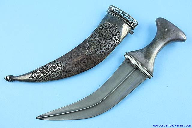 The style of this fine Jambiya Dagger is also known as Indo-Arab for the mixed styles of Jambiya daggers from the Arab peninsula with Indian khanjars. Also it may be that such daggers were made in Indian for wealthy Arabs residing in India or in the peninsula. Classical curved double edge blade with pronounced central rib forged from wootz (Damascus, watered) steel. Whole silver handle. Scabbard covered with leather (later) and mounted with finely pierced silver mounts. Blade 8 inches, total 13 1/2 inches. Late 19C. may be made in Hyderabad. |