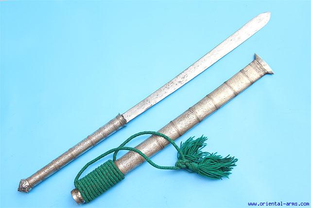 This Dah sword is Thai, late 19 – early 20C. Blade 20 inches long with a spear shaped tip. Beautifully chased silver covered handle and scabbard. Handle is 13 inches long . Total length 37 ½ inches. Very good condition. This sword comes with a green cotton baldric cord. |