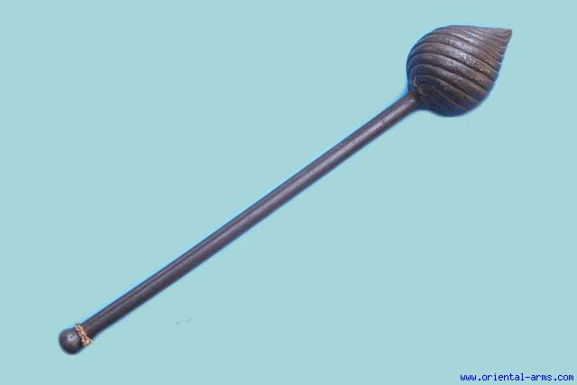 This Rare whole steel mace is Indian, 18 C. , probably central or south India. Light weight spirally ribbed steel head 7 X 5 inches. Steel haft. Total length 28 inches. Very good condition. Very rare.