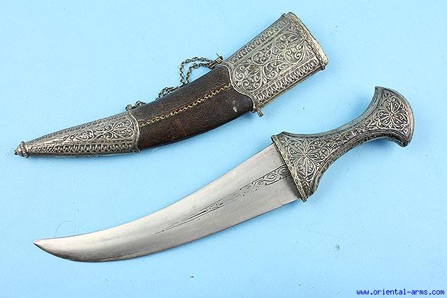 This Jambiya dagger is coming from the Hijaz area, probably Saudi Arabia, early 20C. Very well made with an 8 inches double edge blade, forged from Sham wootz (Low contrast Middle east wootz steel) finely chased silver handle and scabbard mounts. leatrher covered scabbard with spiral stitching. Total length 13 1/2 inches. Very good plus condition. |