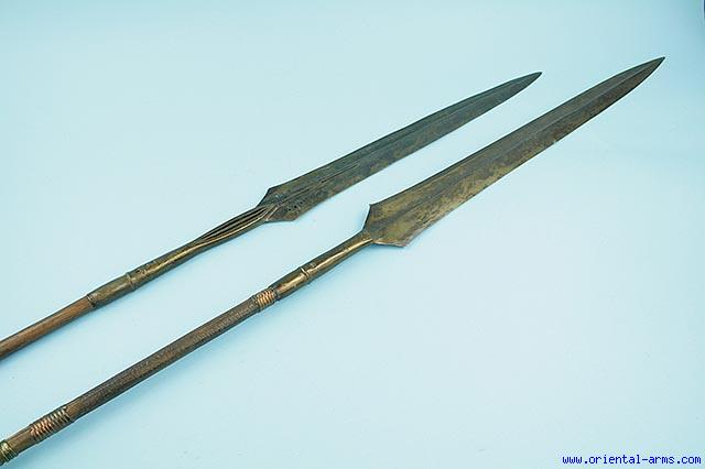 Lot of two long spears, central Africa, First half of the 20C. Exact origin unknown, may be Saka. Blades 18 and 23 inches, finely forged. Wood shafts bound with brass and copper strips, ending with ste3el tails. Length 61 and 63 inches. Very good condition