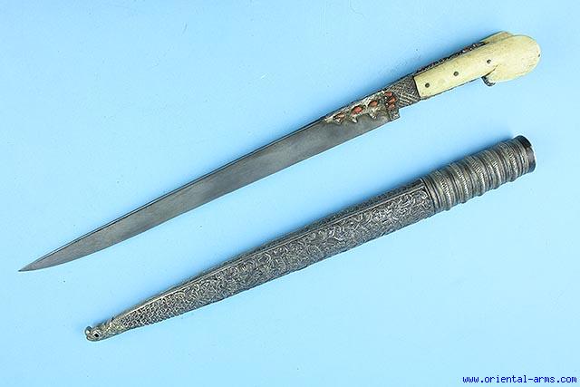 This style of short Yataghan sword is sometimes known as Marine Yataghan, probably because of its length. In contrary to more common Yataghans the blade here is straight with a pronounce T spine, forged from very good steel, most probably sham (low contrast middle eastern wootz) . The grips are walrus ivory with very long and narrow ears. The bolsters and grip strap are filigree silver set with drop shaped and ribbed coral stones. Original whole silver scabbard beautifully chased and engraved. Blade 16 inches long. Total length 24 inches. Very good condition. Repairs on the bolsters spine. |