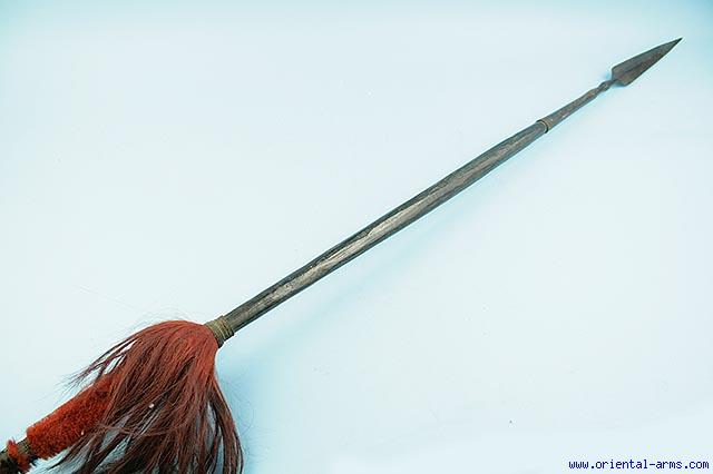 A spear of the Naga people from North East India. Early 20 C. 8 inches steel blade connected with a 8 inches socket to the palm wood pole which is decorated in the classical Naga style with red and tufts of hair on two sectors of the pole. Steel tail. Total length 86 inches. Very good condition. The tip of the blade is very lightly bent, almost unnoticed. Can be easily straighten. Minor losses to the air tufts
