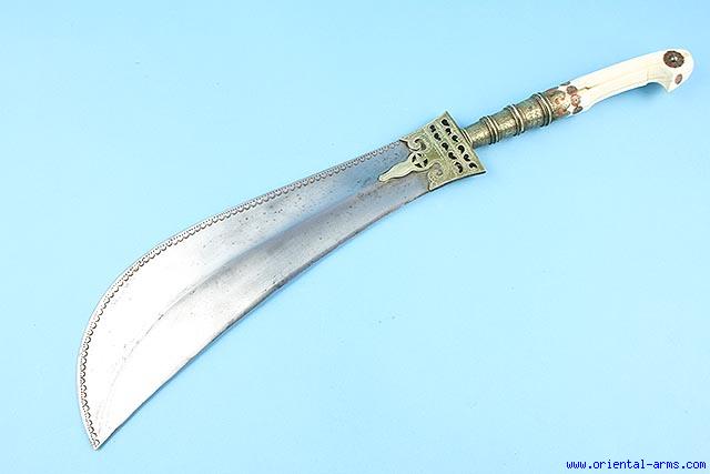The Moplah is the sword of the Coorg people from the Malabar coast of south west India and it is quite a scarce item. The massive 16 inches long and more than 4 inches wide blade is slightly down curving with a flat central rib. The spine is stamped along it entire length with the "eye lashes" mark of quality. The handle is ivory with long chiseled brass bolsters and chiseled brass collars on the blade. Total length 26 inches. Very good plus condition. Good age patina on the handle. South India, early 19C. A massive and very impressive article. |